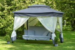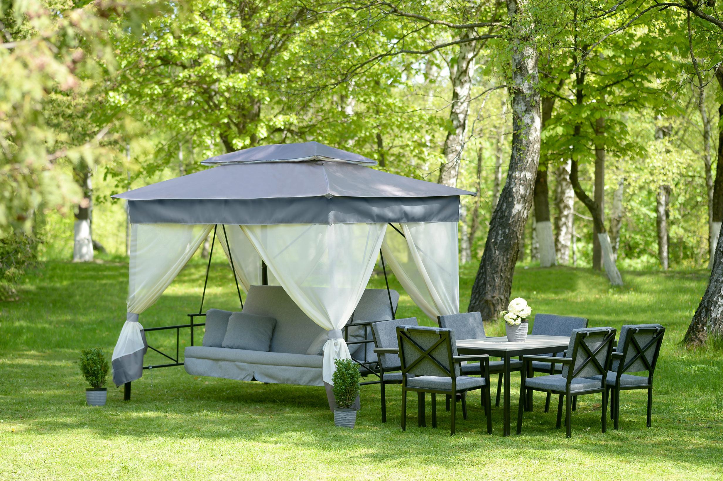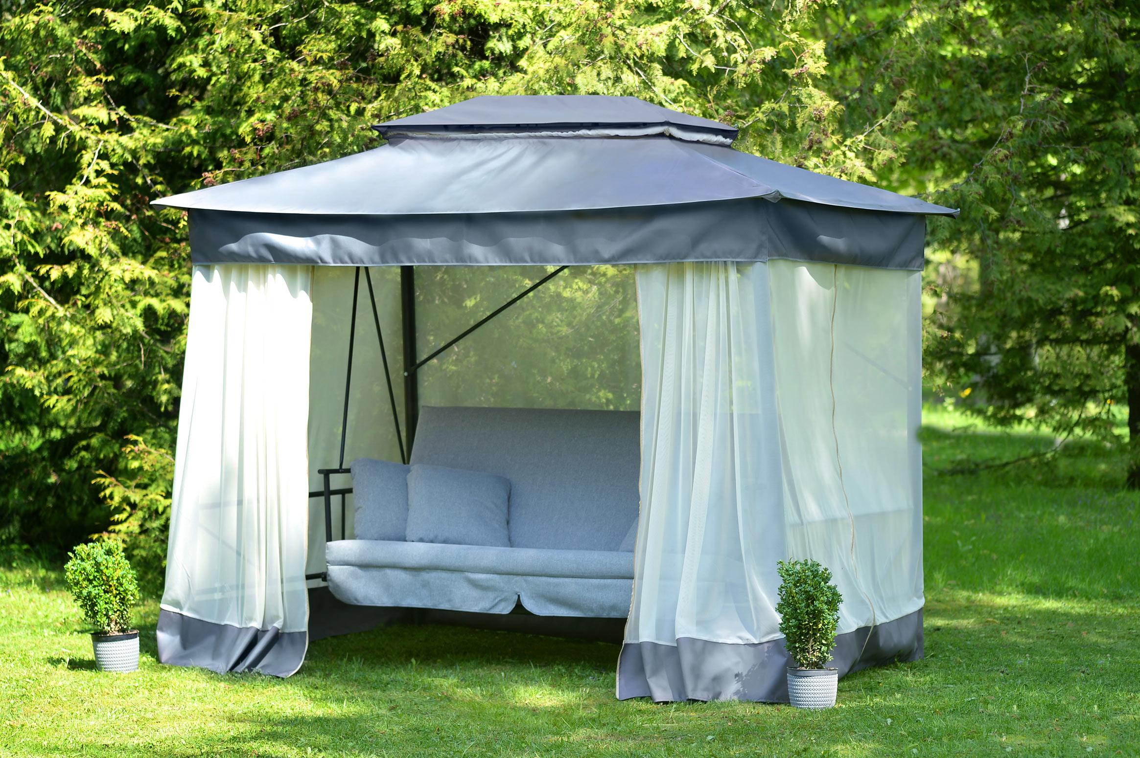 Тент: тент ткань с для кожгалантерейной промышленности 100% п/э плотность 289г/м2. Противомоскитная сетка (полотно гард. полиэф. пл. 39г/м2). Крепление сетки на качелях осуществляется с помощбю застёжек текстильных. Упаковка тента и сетки – мешок из ткани
